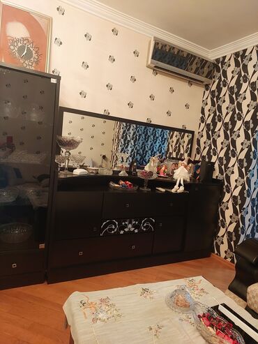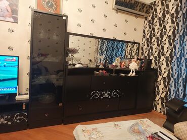 Qonaq otağı mebel dəsti Tərkib: - İki ədəd şüşə vitrin dolab (üst hissəsi şüşəli, alt hissəsi çekmecəli) - Geniş komod + dekorativ böyük güzgü (ağ rəngli ornamentli çərçivə) - TV stendi (iki yan d...