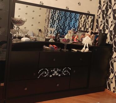 Qonaq otağı üçün mebel dəsti - Komod + böyük dekorativ güzgü: Geniş üst səth, 4 qapılı aşağı şöbə. Parlaq qara fasad, iri dekorativ tutacaqlar, yuxarıda iri, faset kənarlı, qeyri-ənənəvi formalı g...