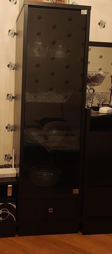 Çatdırılma yoxdurGara rəngdə, müxtəlif saxlama seçimləri təklif edən modul mebel dəsti. Dəstə şüşə qapılı vitrin şkafı, iki geniş siyirtməli və bir şkaf bölməli aşağı kabinet daxildir. Vitrin hissəsində şüşə qapılar və dekorativ naxışlar var. Aşağı kabinetdə şüşəli qapılar və əlavə saxlama üçün iki siyirtmə var. Dəstə həmçinin uzunsov şüşə qapılı şkaf və güzgülü siyirtməli siyirtmə daxildir. Bu mebel dəsti qonaq otağı və ya yataq otağı üçün uyğundur.