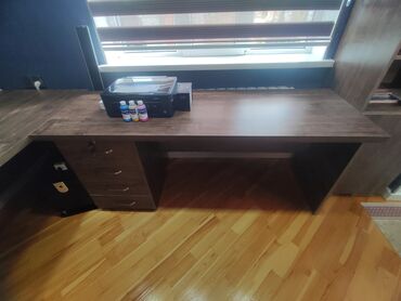 - L formalı geniş iş masası: iki tərəfli iş səthi, kompüter və çap qurğusu üçün rahat yerləşim.