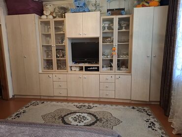 100azn .Qonaq otağı üçün çoxfunksiyalı divar modulu - Material: laminat/LDSP (qoz rəngi və açıq krem kombinasiya) - Tərkib: vitrinli qab-dad otağı şkafı, TV üçün yer, açıq raflar və dörd alt çekme...