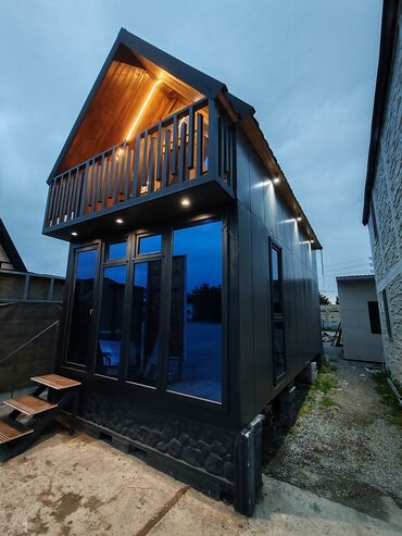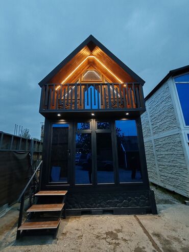 Taxta karkaslı mobil ev/konteyner ev - Xarici örtük: Şaquli taxta işləmə, tünd şabalıd rəngdə; metal dam örtüyü; yağış boruları; geniş panoram şüşəli pəncərələr və metal giriş qapısı. - Daxili pla...