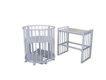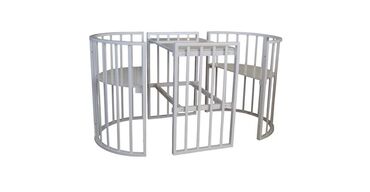 - Dairəvi və oval formalara çevrilən modul konstruksiya: beşik, yelləncək/oyun manje, kiçik kolyaska tipli beşik (təkərli versiya), böyüdülmüş oval çarpayı və ayrıca komod/masa konfiqurasiyasına yığıla bilir.