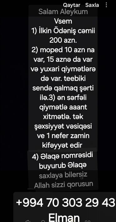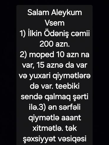 - Gündəlik 10 AZN, 15 AZN və daha yüksək məbləğlərlə də moped variantları mövcuddur