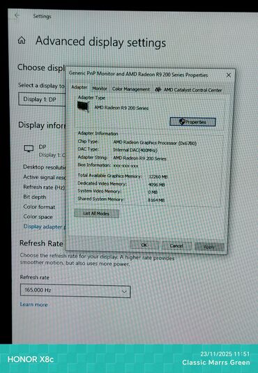 - Windows “Advanced display settings” bölməsində AMD Radeon R9 200 Series 4 GB olaraq görünür