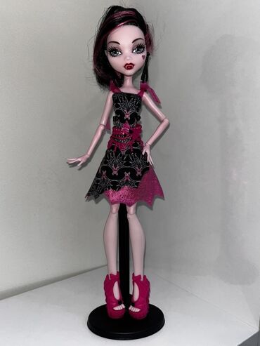Monster High üslubunda moda kuklası DRACULAURA reboot - İkirəng saç: yarısı çəhrayı, yarısı qara uzun saç. - Geyim dəsti: çəhrayı şifon üst, qara lentli yaxalıq, ürək naxışlı qara şortik, dizə qədə...
