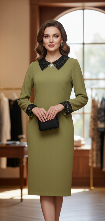 - Yaxa: qara nazik krujeva ilə bəzədilmiş qəlpikli yaxa, ortada kristallı bəzək