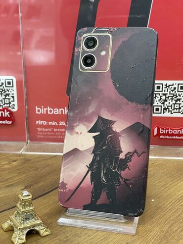 Moto G14 smartfon - Ekran: 6.5" böyük tam ekran, mərkəzdə punch‑hole ön kamera - Arxa kamera sistemi: ikiqat modul + LED flaş, qızılı konturlu zərif blok - Dizayn: arxa tərəfdə samuray temalı, qır...