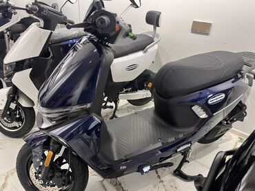 Mavi rəngli şəhər skuterı - Gündəlik şəhər içi istifadə üçün yığcam və praktiki dizayn - Elektrik/benzin tipinə dair məlumat göstərilməyib; standart ayaq dayağı və orta ayaq dayağı mövcuddur - Gen...