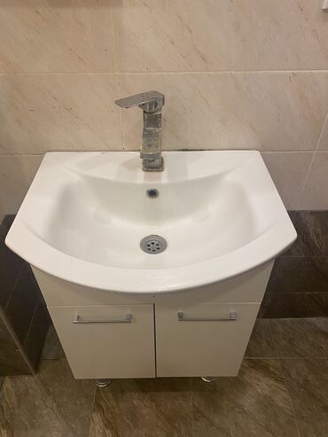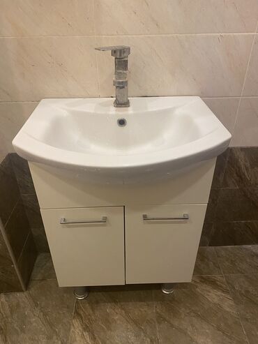 Hamam üçün divara montaj olunan lavabo və şkaf dəsti - Material: cilalanmış daş/daş-kompozit üst hissə, monolit kvadrat formalı qab; aşağıda laklı ağ MDF çekmecəli modullu şkaf - Rəng və dizayn: a...