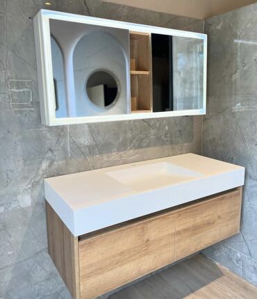 Vanna otağı üçün müasir plastik moydadır dəstləri - Material: nəmliyə davamlı, yuyulması asan plastik (fasadlar), keramika/akril üst lavabo - Dizayn: minimal xətləri olan asma və döşəməüstü varian...