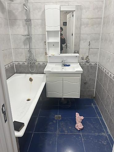 Ağ rəngli keramika Çanaq və boz rəngli taxta dolabdan ibarət hamam
