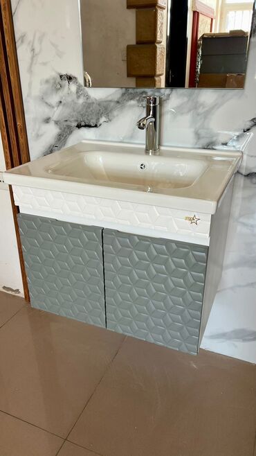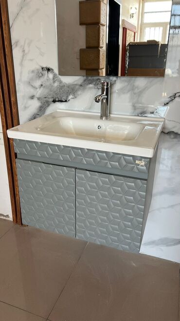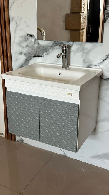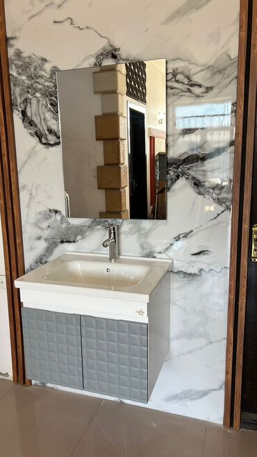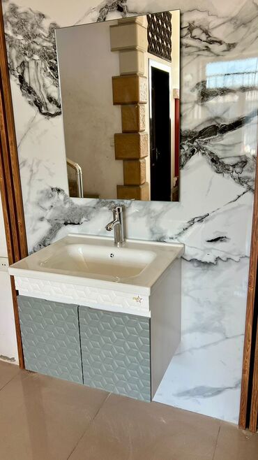 Soyunma otağı/vanna otağı üçün lavabo mebeli dəsti - Üst tabla: ağ mərmər naxışlı səth - Alt dolab: divara montaj üçün nəzərdə tutulmuş, ağ rəngdə MDF/taxta əsaslı korpus - Modeldən asılı olaraq...