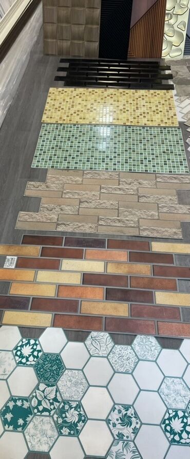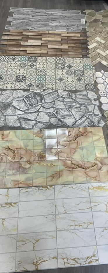Şəkillərdə təqdim olunan nümunələr mövcuddur: mavi/boz kvadrat mozaik setləri, qızılı damarları olan ağ mərmər panellər, pastel-bej abstrakt kvadratlar, “balıq sümüyü” bej kombinasiyası, boz və qəhvəyi taxta effektli listlər, qara və mis-metal heksaqonlar, zərif çəhrayı-şampan mozaik heksaqon şəbəkəsi və s.
