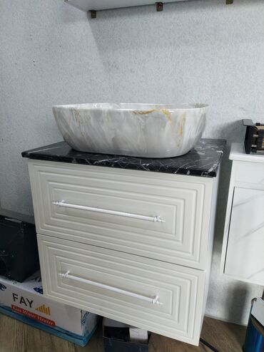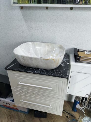 Mərmər effektli üstdən qoyulan əl üzü yuma qabı və vannaotağı dolabı komplekti.