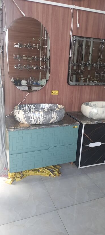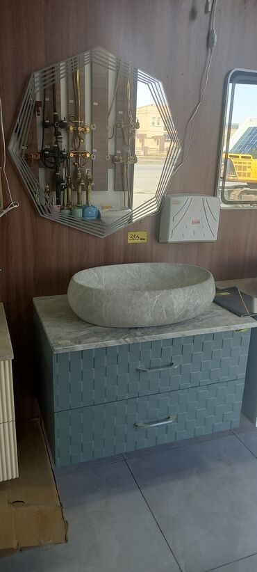 - 385 AZN – səkkizguşəli güzgü ilə göstərilən boz-yaşıl dolab üstü boz lavabo.
