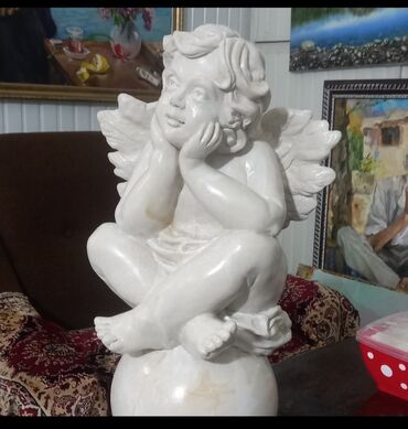 - Nümunə 1: qanadlı mələk fiquru. Dizayn: top üzərində oturan, çənəsini əllərinə dayamış uşaq-mələk. Detallar: qanadlar, saç və paltar qatlardakı incə işləmə. Dekorativ iplə bəzədilmiş dairəvi postament.