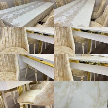 - Rəng və dizayn: krem-ağ fon üzərində qızılı damarlarla mərmər effektli masaüstü; stullarda eyni tonlarda parça ilə harmonik komplekt