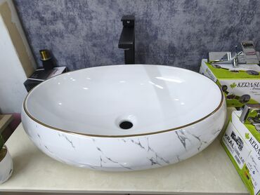- Dizayn: Oval forma, ağ keramik səth üzərində zərif boz mərmər damarları və üst kənarda qızılı xətt detalı