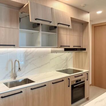 L formal ofis künc masası – iki rəng kombinasiya: isti ağac tonlu üst tabla və tünd boz yan panellər. Geniş iş səthi kənarda yüngül dalğalı forma ilə rahat bilək dayağı yaradır. Üstdə kabellər üçün...