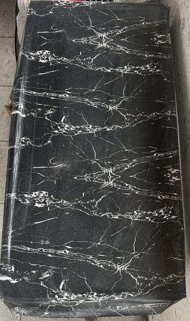 - Üst səth: Qara fonda ağ damarlarla mərmər fakturalı (laminat/daş effekti) masaüstü, yumru künclü dizayn.