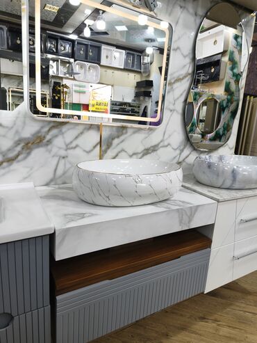 Mərmər effektli üstdən qoyulan əl üzü yuma qabı və vannaotağı dolabı komplekti. - Üst qab: oval-düzbucaqlı forma, parlaq ağ-boz tonlarda mərmər naxışlı, qızılı damar keçidləri ilə. Mərkəzi drenaj...