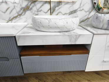 Hamam və sanitar avadanlıqları komplekti - Asma hamam mebeli: iki ədəd müasir dizaynlı, boz rəngli şkaf modulu, üstü mərmər teksturalı stolüstü ilə. - İki ədəd qabdaqrafik (üstüqoyma) əl üzüyü: bi...