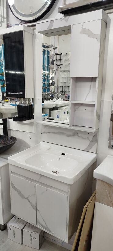 - Komplekt: asma güzgülü şkaf + açıq rəfli yan bölmə + alt dolab + keramika əl-üz yuma qəfəqəsi (leyka).