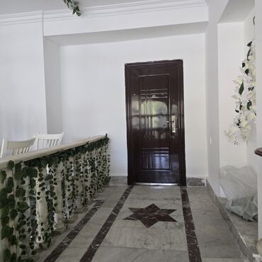 - Giriş: Zərif naxışlı, şüşə əlavəli ikitaylı qapı, mərmər eyvan və pilləkən.