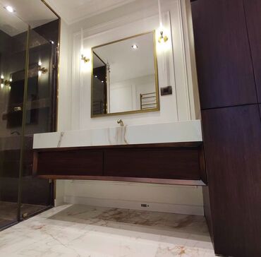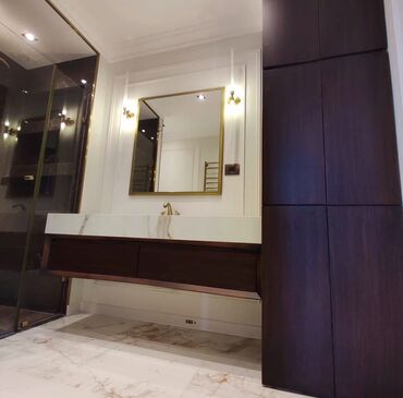Mərmər səthli, qəhvəyi rəngli dolablı, divara quraşdırılmış unitaz dəsti. Dəstə güzgü, iki ədəd divar lampası və dəsmal asmaq üçün yer daxildir. Unitaz, həm də paltaryuyan maşın üçün əlavə dolabla təchiz olunmuşdur.