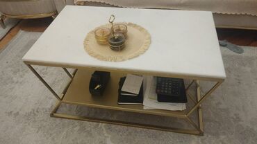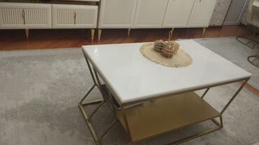 Ağ rəngdə salon/otaq üçün oturacaq qarşısı jurnal masası. Xüsusiyyətlər: - Üst hissə: qalın şüşə panel (mərkəzdə düz, kənarlarda dekorativ haşiyə). - Korpus: krem-ağ rəngli, klassik xətli dizayn. ...