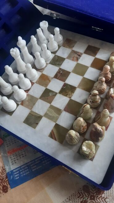 - Qarşı tərəf — təbii oniks naxışlı (yaşıl, qəhvəyi, krem çalarlarında) daş fiqurlar.