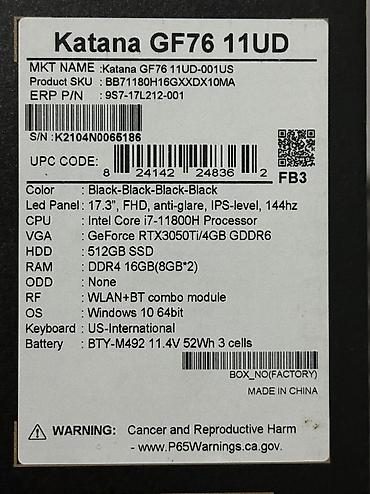 Msi Katana GF76 Gpu: 3050ti Cpu: i7-11800h Yaddas Tutumu: 512gb Nvme2