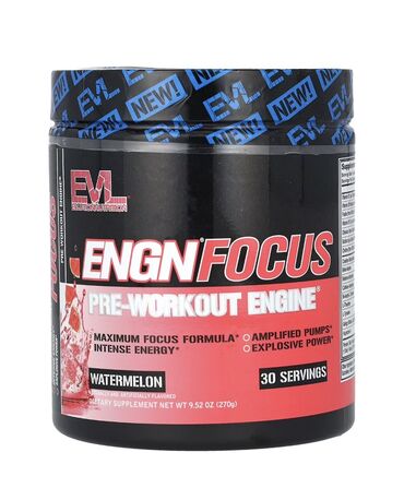 - EVLUTION NUTRITION ENGN Focus – Watermelon dadı. Xalis çəkisi: 270 q (9.52 oz). 30 porsiya. Etiketdəki vurğular: “Maximum Focus Formula”, “Intense Energy”, “Amplified Pumps”, “Explosive Power”.