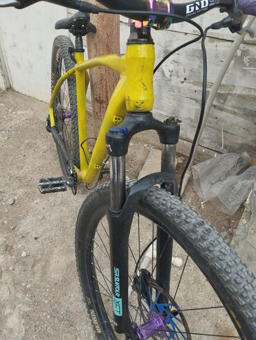 Dağ velosipedi – xüsusi yığma - Çərçivə: karbon lif naxışlı, stikerlərlə fərdiləşdirilmiş - Amortizasiya: ön vilka və arxa şok absorber (full-suspension) - Sükan: bənövşəyi rəngli enli dağ tipli s...