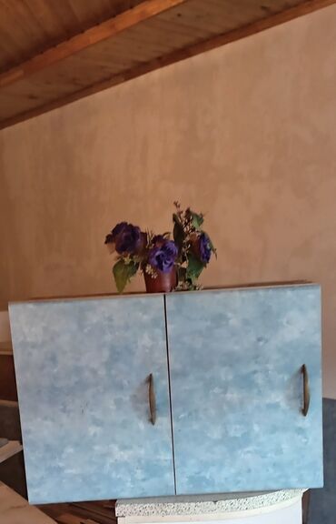 - 3 ədəd düz asma şkaf: ön fasadları açıq mavi rəngli, iki qapılı. Qapılar metal tutacaqlıdır. Korpus ağ rəngdədir. Yan hissədə açıq rəf bölmələri görünür.