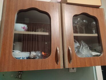 - Üst hissə: şüşə pəncərəli ikili qapılar (dekorativ kontur), daxildə rəflər; əlavə olaraq kor qapılı modul və açıq alt rəf/nişa
