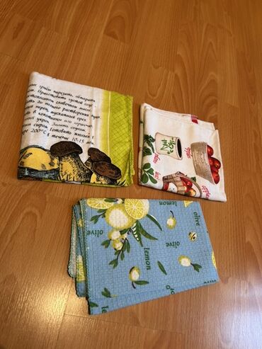Məhsul: Tekstil dəsti – mətbəx dəsmalları və yataq dəstləri. 10 ədədi 16 man Mətbəx dəsmalları: - 3 ədəd müxtəlif dizayn: iynəyarpaq və qırmızı giləmeyvə motivli, boz-sarı xətli dama na...