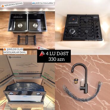 - Mətbəx kranı: metal gövdə, tək tutacaqlı qarışdırıcı, yüksək “U” formalı lülə, isti–soyuq su üçün şlanqlar və montaj detallar ilə.