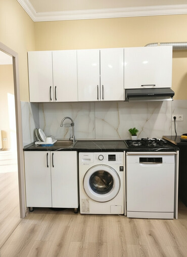 Mətbəx üçün hazır quraşdırılmış həll: şkaflar, işçi səth, lavabo-kran, aspirator, qaz plitəsi,