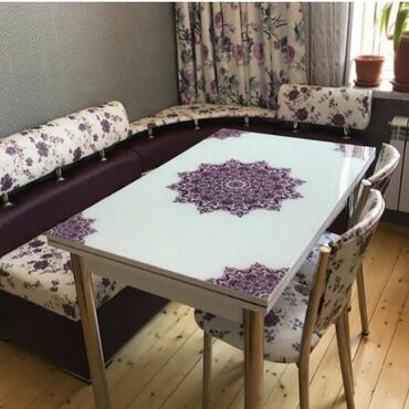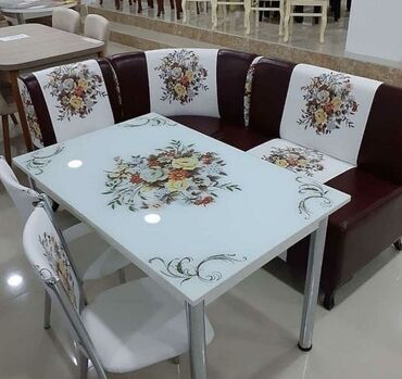 Mətbəx künc dəsti – şüşə səthli masa, künc divan və 2 stul komplekti.