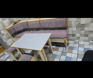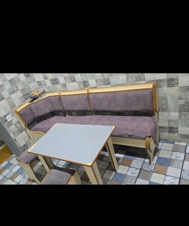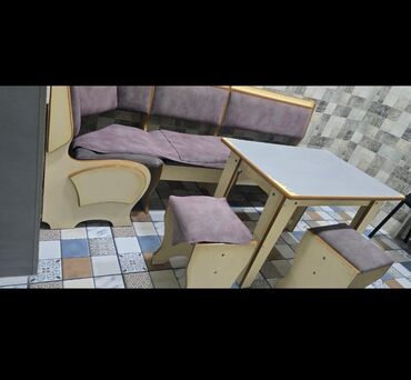 - Dəst tərkibi: L formalı künc oturacaq, kvadrat masa və 2 taburet.
