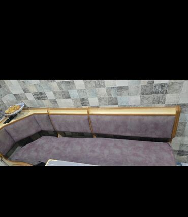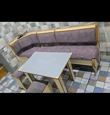- Rəng və material: açıq krem rəngli ağac karkas, bənövşəyi/moruğu tonlarında yumşaq parça oturacaq və arxa hissə; masanın üstü açıq boz rəngdədir, kənarları taxta haşiyəlidir.