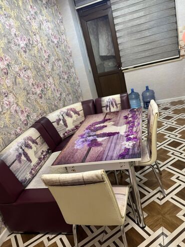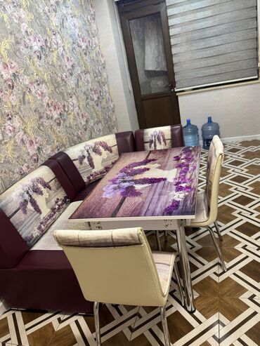- Komplekt: şüşə səthli yemək masası, L formalı künc divanı və 2 ədəd stul