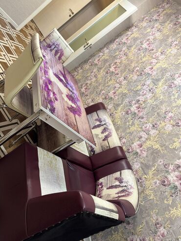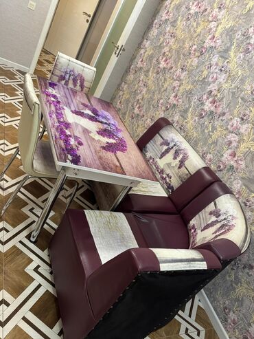 - Künc divanı: süni dərinin kombinasiyası (bordo + printli hissələr), yumşaq süngərli oturacaq və bel hissəsi