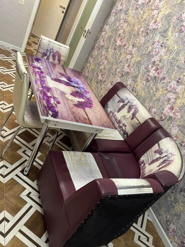 - Üstünlüklər: silinməsi asan şüşə masa, möhkəm metal ayaqlar, dekorativ çiçək tematikası ilə interyerə uyğunlaşır, rahat bel dəstəyi