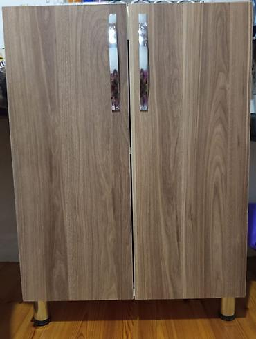- Üst və alt dolablar: açıq krem və ağac teksturalı kombinasiya, parlaq xrom tutacaqlar. Şüşə vitrinli qapılar, müxtəlif ölçülü bölmələr.