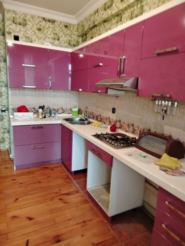 Mətbəx mebeli və texnika dəsti - Künc yerləşimli mətbəx mebeli: krem və bənövşəyi rəng kombinasiyası, parlaq fasadlar, metal tutacaqlar. - Yuxarı və aşağı şkaflar, künc bölmələri, bir neçə çekmece...