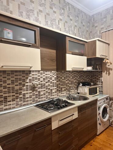- Üst və alt dolablar: ağ-krem və qəhvəyi rəng kombinasiyalı, ağac teksturalı fasadlar; şüşəli (mat) vitrin qapıları; uzun metal tutacaqlar.