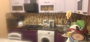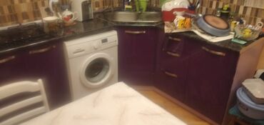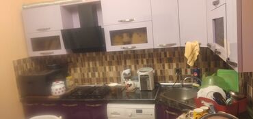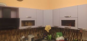 Mətbəx mebeli və texnika dəsti - Künc yerləşimli mətbəx mebeli: krem və bənövşəyi rəng kombinasiyası, parlaq fasadlar, metal tutacaqlar. - Yuxarı və aşağı şkaflar, künc bölmələri, bir neçə çekmece...